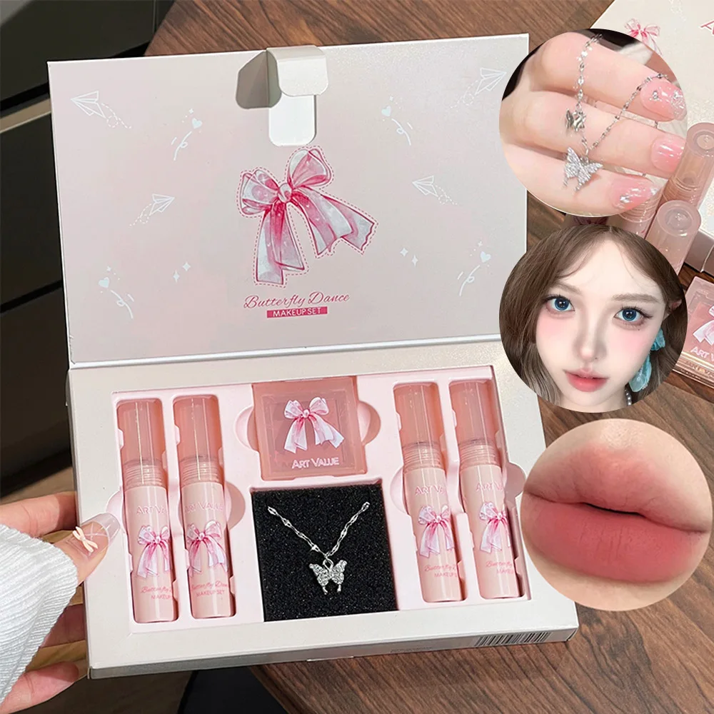 Art Value Butterfly Dance Color Box Four Lip Glaze Blush Set Necklace Lip Mud Blush Set