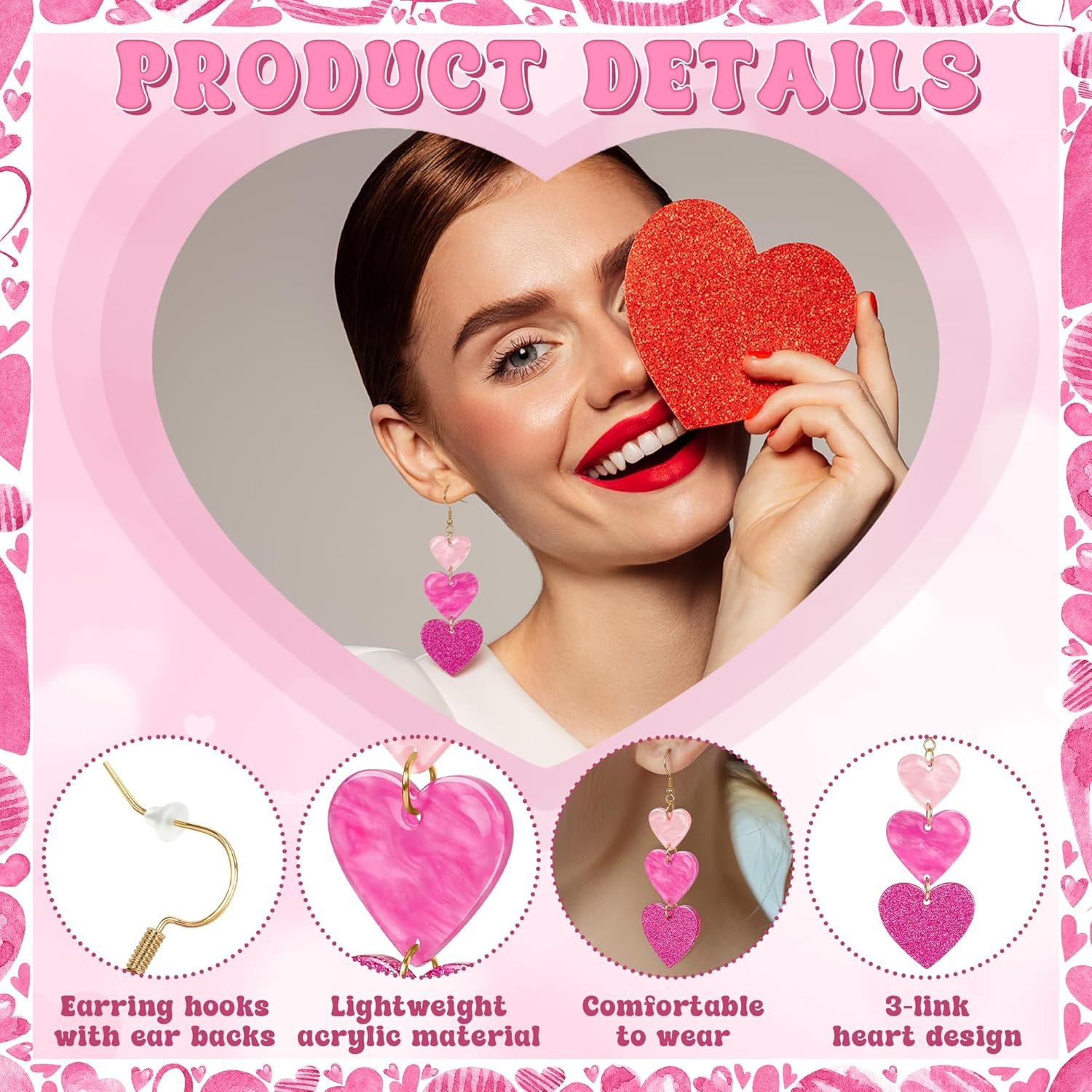 I ordered these pink acrylic Valentine’s Heart earrings as a fun, lightweight option to celebrate the Valentine’s & Galentine’s holidays. The earrings are so pretty & absolutely adorable. The acrylic is pink & sparkling which will easily match any of your holidays outfits. The leverback style also has quality silicone backs to prevent the earrings from slipping out of your ears. I would definitely order additional earrings for other holidays from the vendor.