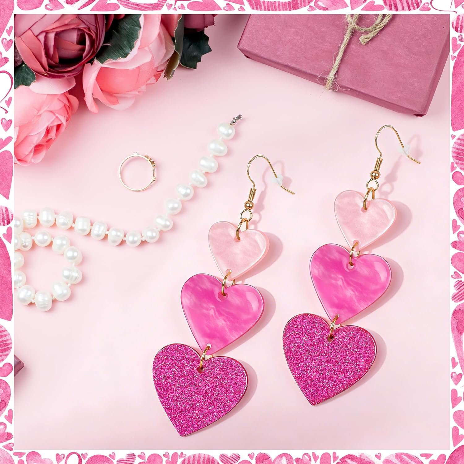 These heart dangle earrings are beautiful! The three layered hearts (soft pink, marbled pink, and glitter) look really high-quality and catch the light so nicely. They’re lightweight, don’t pull on my ears, and feel comfortable to wear for hours. I’ve already gotten compliments—highly recommend!